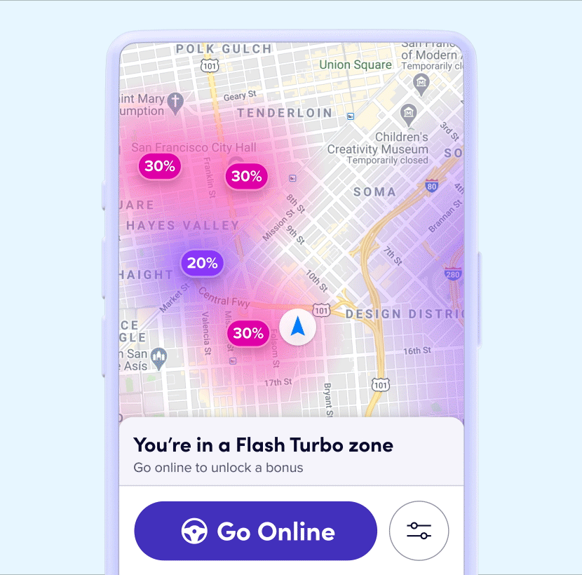 Flash Turbo shows you where it’s busy in real time on the map. You’ll unlock a bonus on your next ride when you drive into one of these areas.