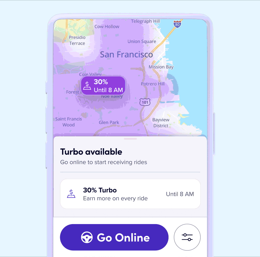 Earn 10–40% more per ride with Turbo. You’ll see upcoming Turbo offers in your weekly planner. Just drive when and where they’re offered, and watch your earnings stack up. Turbo is available only in select regions.