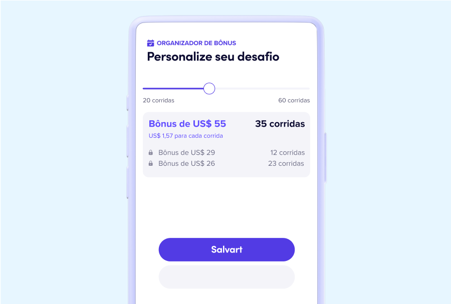 Ganhe um bônus por fazer um determinado número de corridas dentro de um período. Você pode escolher uma Meta de Corridas que se encaixe nos seus planos.