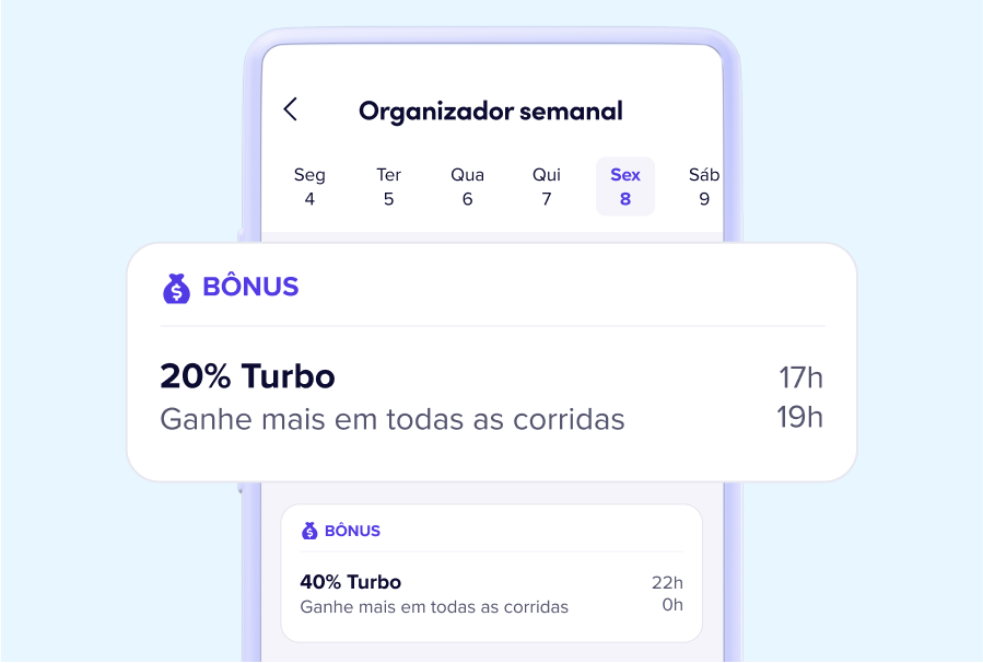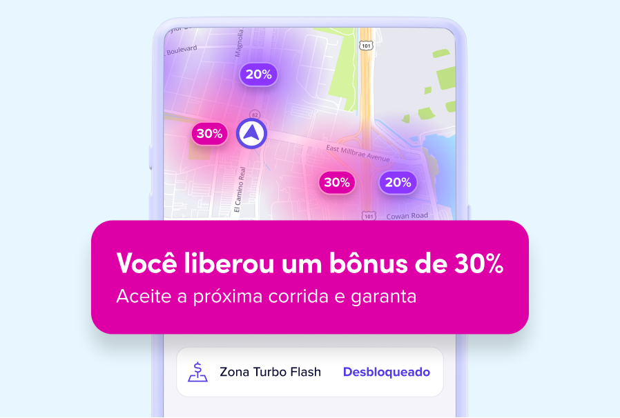 Ganhe de 10% a 40% a mais por corrida com o Turbo. Você verá as áreas Turbo todas as semanas durante os horários mais movimentados. Basta dirigir quando elas forem oferecidas e ver seus ganhos aumentarem. O Turbo está disponível apenas em algumas regiões selecionadas.