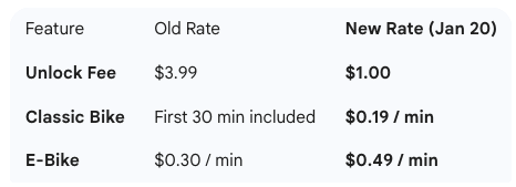 The Big Takeaway: Under the old system, you paid a minimum of $3.99 even if you only rode for 2 minutes. Now, your ride cost scales better with the length of your trip. If your trip is under 15 minutes (which over ⅔ of single rides on ebikes and over ½ of single rides on classic bikes are), you’re saving money with this change.