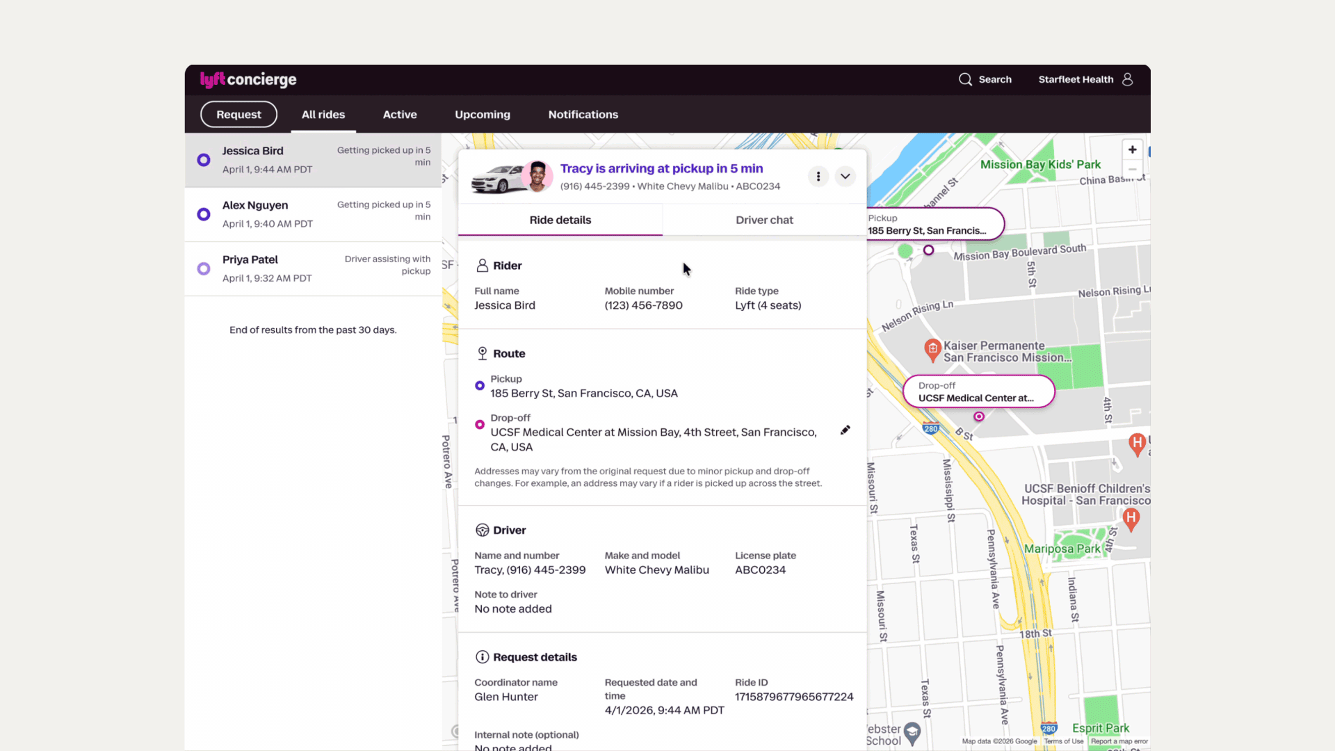 Once a driver is assigned to a ride, you'll see a new ‘Driver chat’ tab inside the ride details card in the Concierge web app.