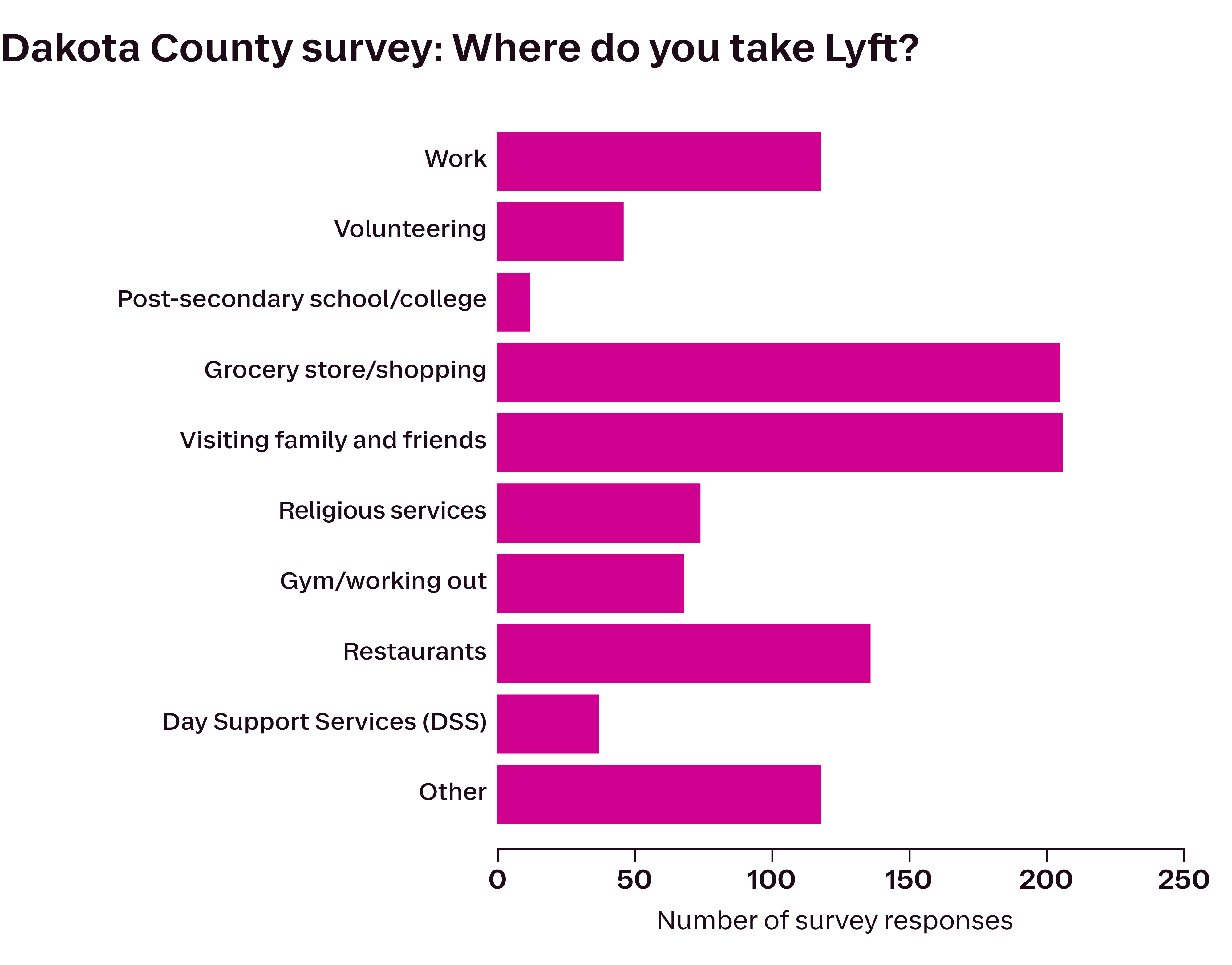 The write-in survey responses gave further insight into why the Lyft partnership is working for Dakota County’s residents with disabilities — and changing lives. About a fifth of respondents noted how the program has freed them from having to rely on friends or family to drive them around. One respondent, who had nearly missed a cousin’s wedding, noted: “With Lyft, that barrier has been removed, and I don’t need to bother my family. And I don’t need to worry about missing a wedding again!” Another reflected, “I’m far less depressed knowing I can go out and do things, and I no longer have to burden others.”