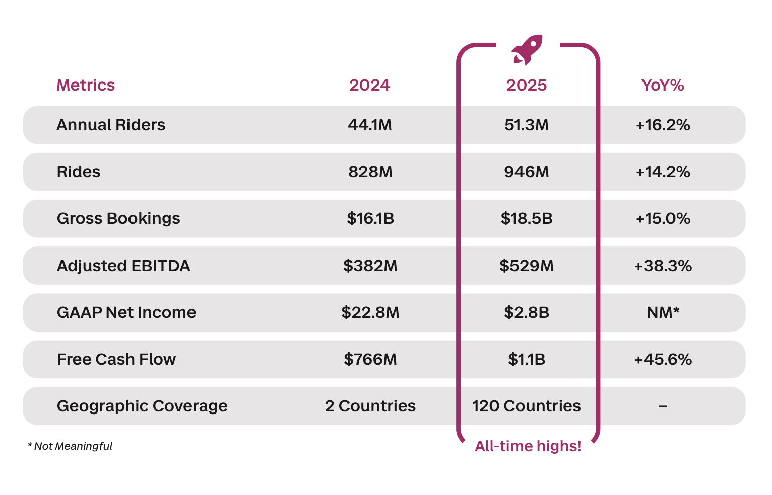 We believe AVs represent a trillion-dollar-plus opportunity over the next decade, with a broad set of players participating in a once-in-a-generation mobility transformation. AVs are already bringing new riders to rideshare and unlocking new use cases. In San Francisco, the global hub for this tech, the market added millions of AV rides in Q4 '25 alone. Meanwhile, Lyft rides delivered by drivers grew almost 10% YoY in the region – faster than comparable cities. As rideshare adds AVs, the pie gets bigger.