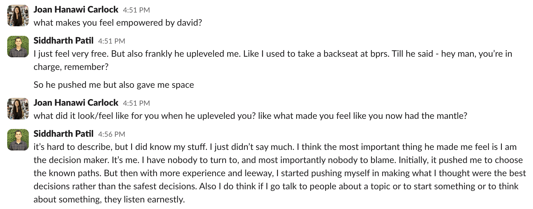 Then as I read the summary of my ideas, I wondered: Were they really that great? And did we actually land on the right outcome? With my leaders, I often coach them to say less and develop their teams to be the experts. I had done the exact opposite. So, I did the tech thing — I launched an experiment. I didn’t tell anyone, but I intentionally tried stepping back to empower the leaders around me in different ways. A few months later, my Chief of Staff asked me if I had changed something. She had observed some shifts on our team, illustrated by an exchange she had with our EVP of Rideshare Experience & Marketplace, Sid.