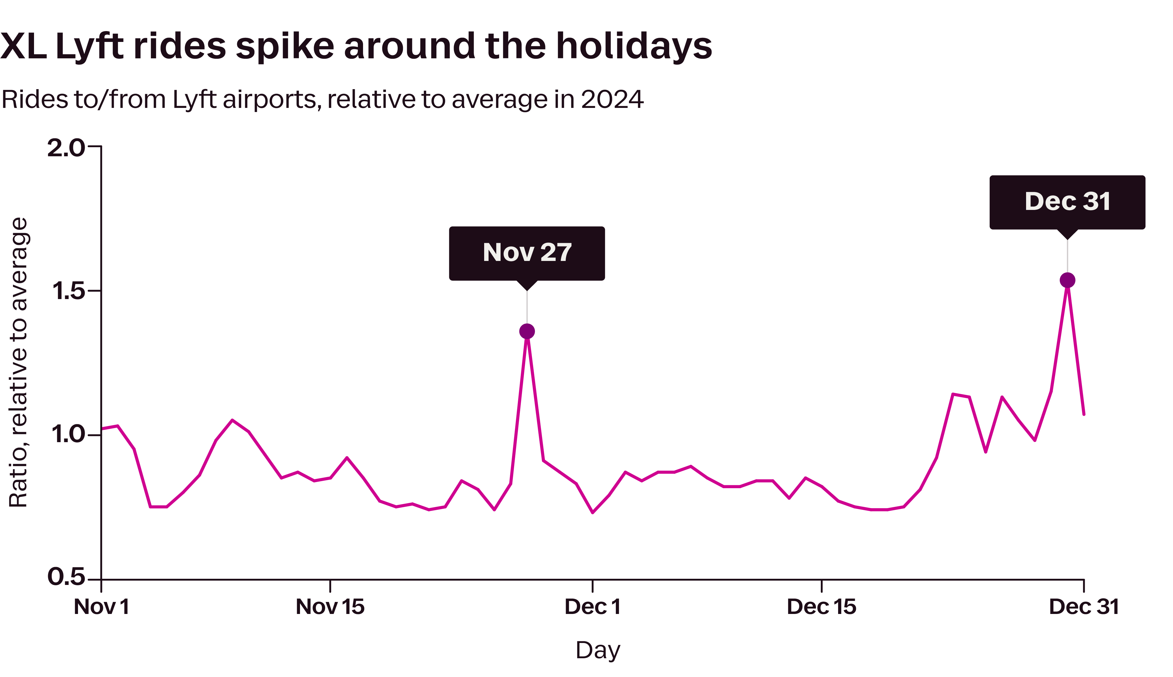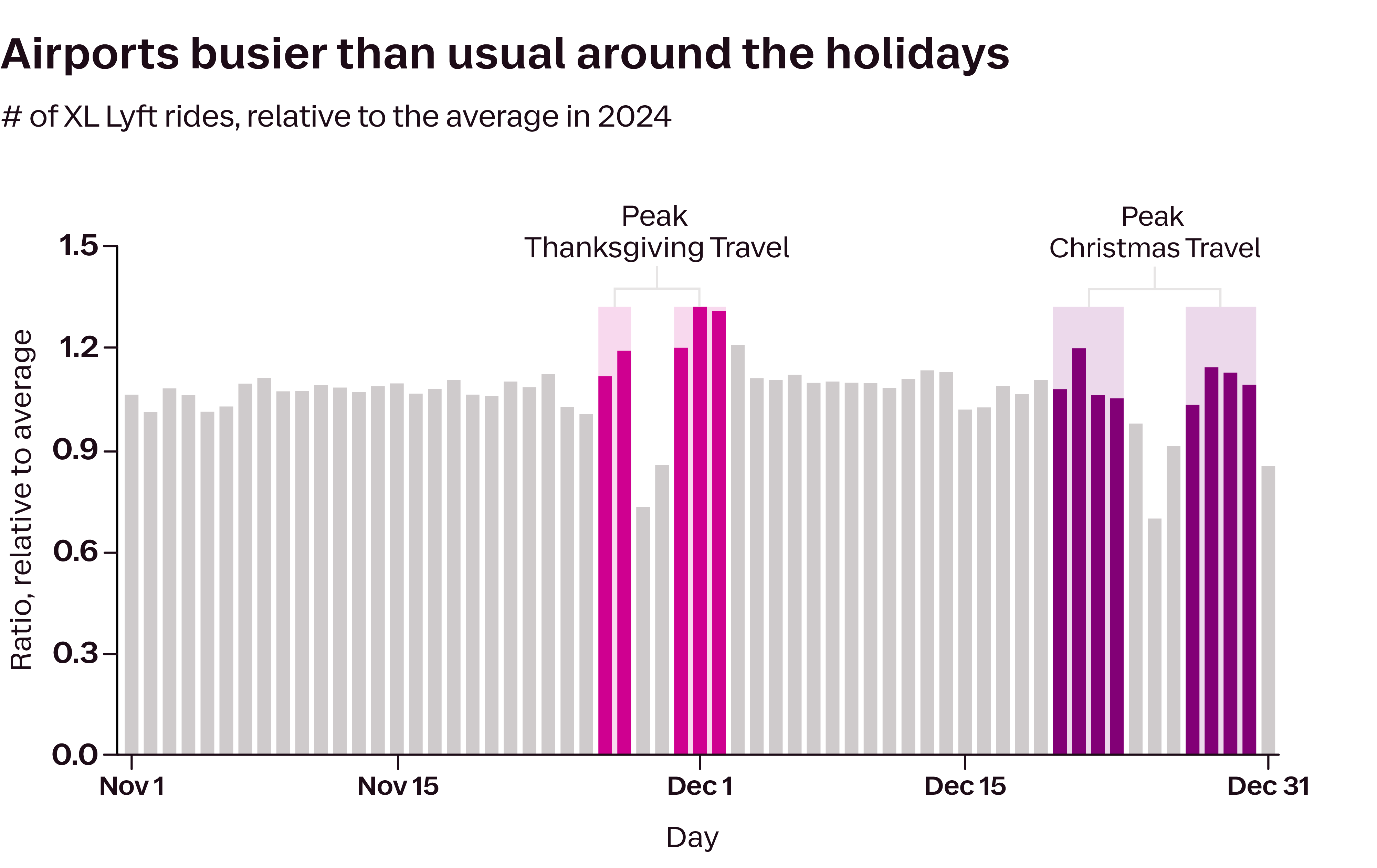 Riders are right to worry. The Wednesday before Thanksgiving is one of the busiest days to fly — there are 20% more rides to/from airports than usual. The Sunday and Monday after Thanksgiving are even more hectic: Rides to the airport are 30% above their normal levels.