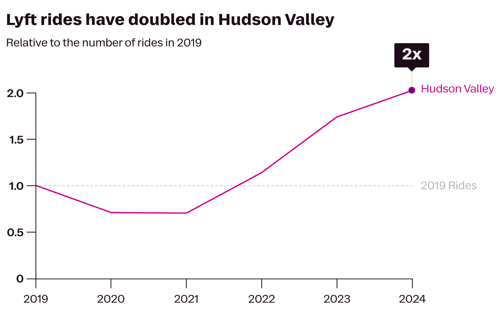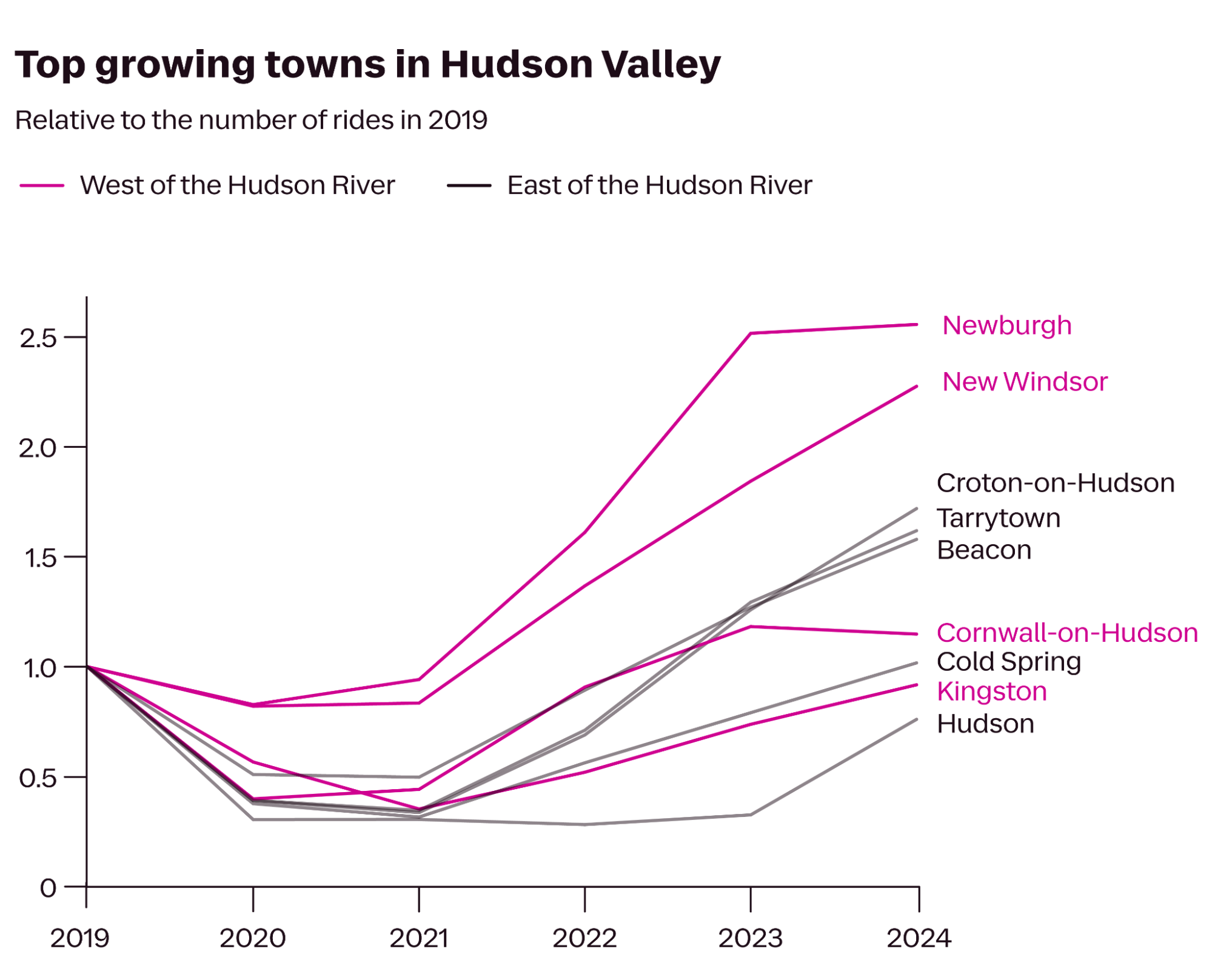 Pre-2020, towns on the east side of the Hudson River, where the Metro-North’s Hudson Line runs from Grand Central and takes you to spots like Tarrytown (a stone’s throw to spooky Sleepy Hollow) and Beacon (home of the popular Dia Beacon art museum), attracted the most Lyft riders.