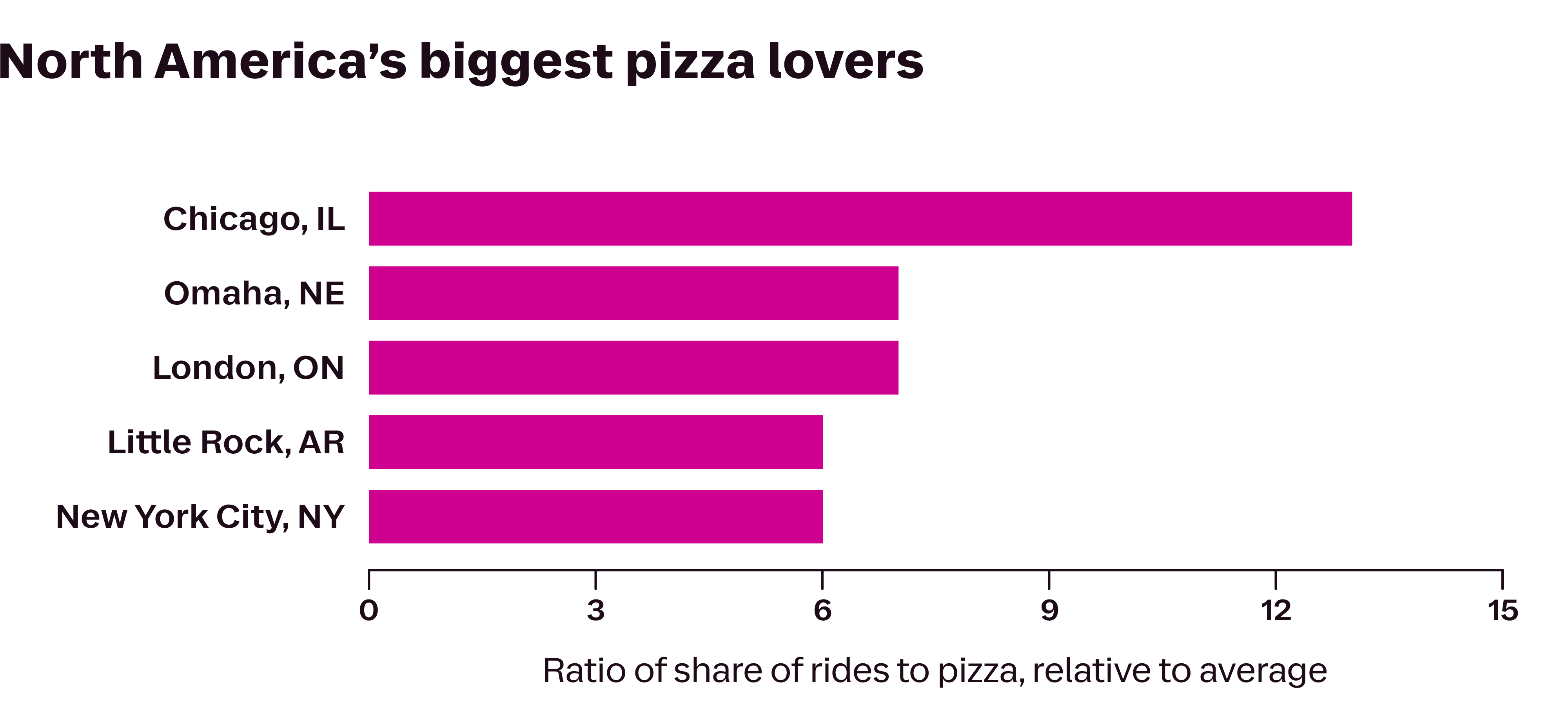 And who is most likely to be going out for pizza? Well, it’s hardly a surprise that the answer is Chicagoans — by nearly double the next city. You probably wouldn’t guess the second- and third-place cities, though — it’s not L.A. or even New York, though they definitely love their ’za. Coming in second for most likely to ride to pies? Omaha, Nebraska. Third? London, Ontario. We know how you all will be celebrating the holiday this year!