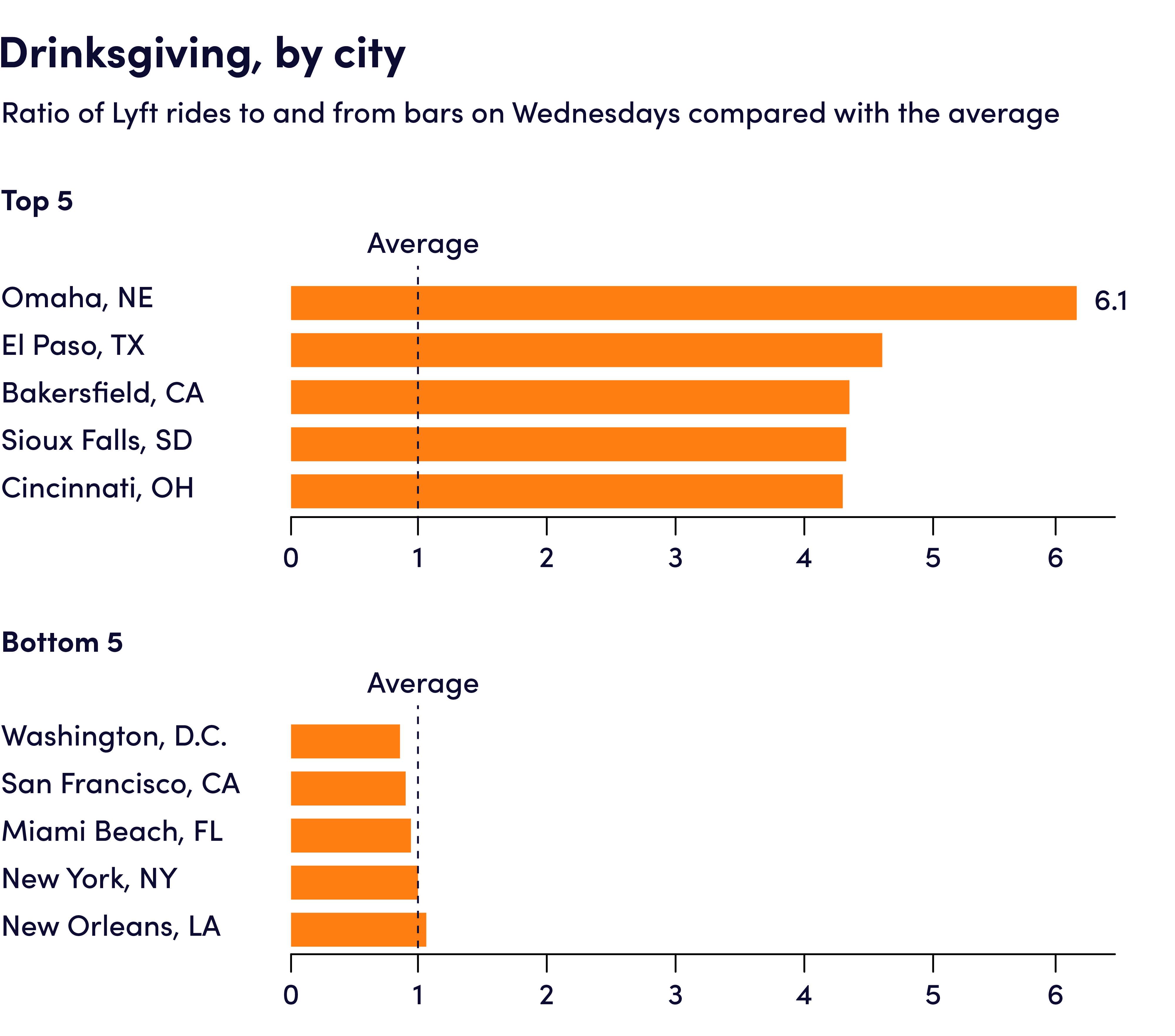 Interestingly, the cities that saw the biggest jump in pre-Thanksgiving bar visits weren’t stereotypically bustling urban centers. For instance, Omaha experienced the largest increase in bar rides — more than six times the average — followed by the likes of El Paso, Texas, Bakersfield, California, and Sioux Falls, South Dakota. Big cities like New York, San Francisco, and Washington, D.C., didn’t see any increase at all, or even saw a small decrease. It seems the Hallmark movies are right — big city dwellers really do head home for the holidays.