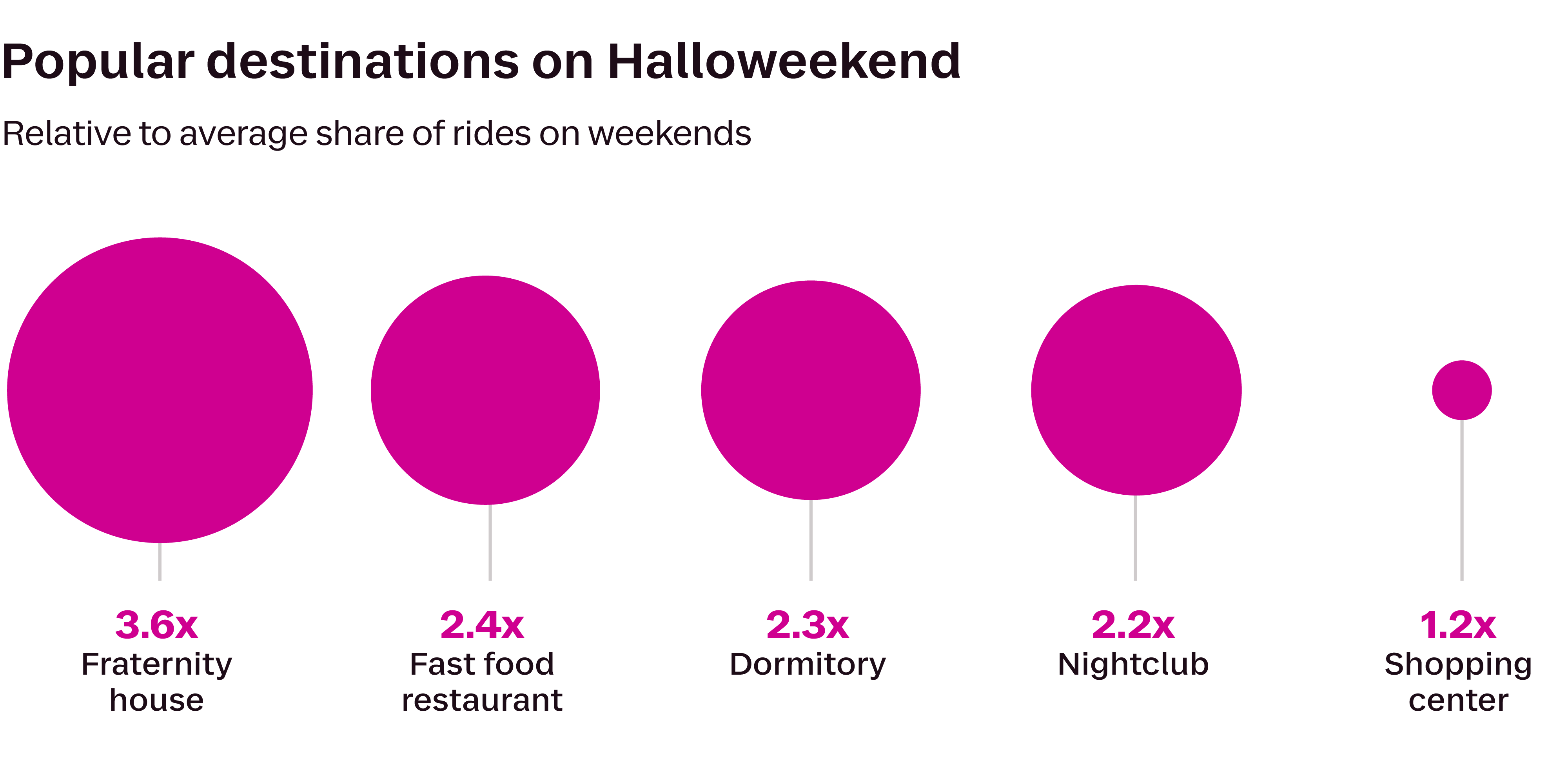 Compared with a normal weekend, rides to frat houses are 3.6 times higher on Halloweekend. Rides double to nightclubs and fast food locations (what better way to end a spooky night out?), and rides to stores increase by 20% (probably as students go out for last-minute costume, food, and drink needs).