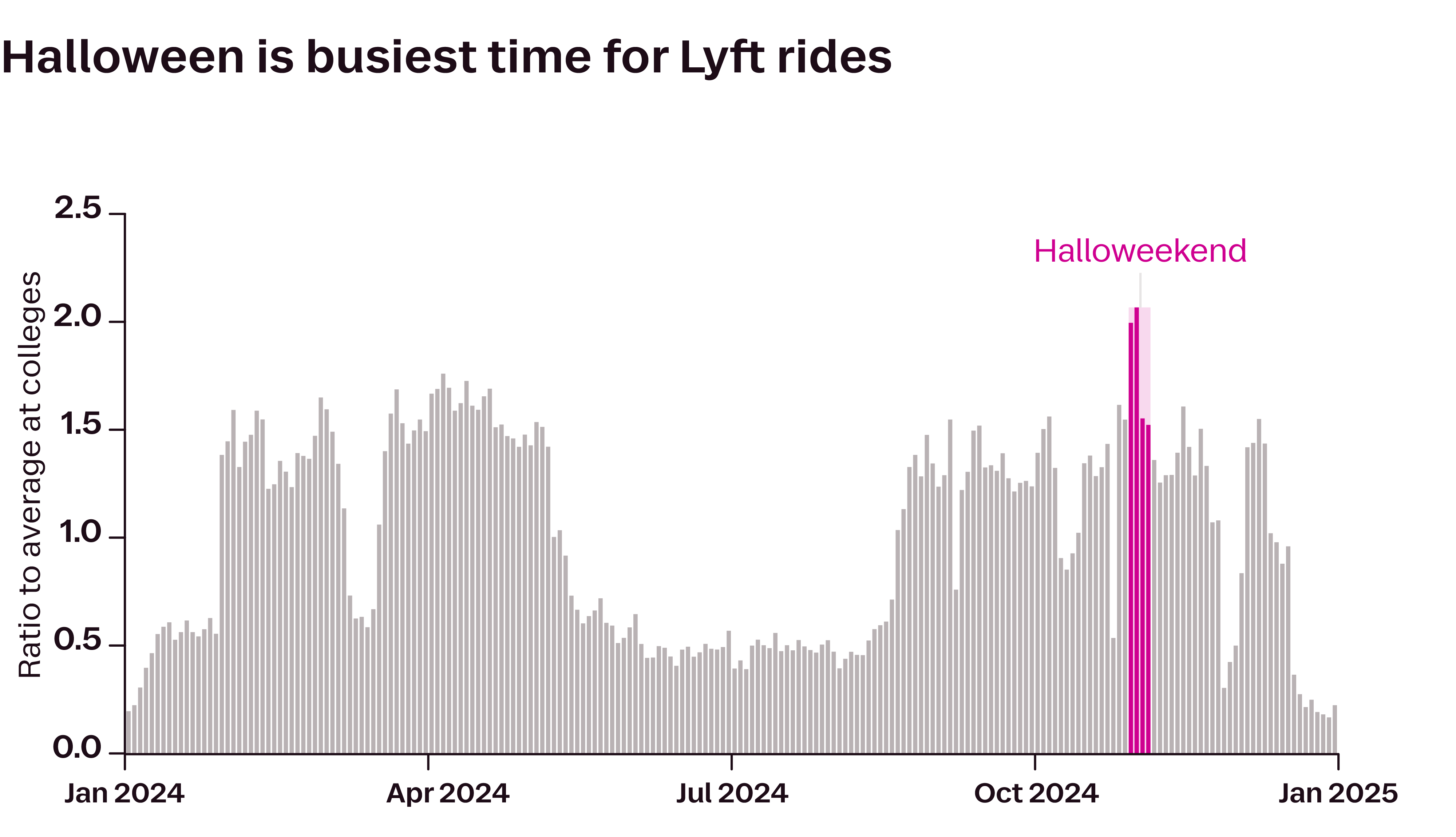 Halloween is one of Lyft’s busiest nights of the year. This is particularly true at college campuses, where the holiday stretches across the whole weekend. In fact, there are twice as many rides on Halloween weekend (Thursday to Sunday) relative to other weekends in the fall, as students leave their dorms to flaunt their ’fits at (mostly) frats.
