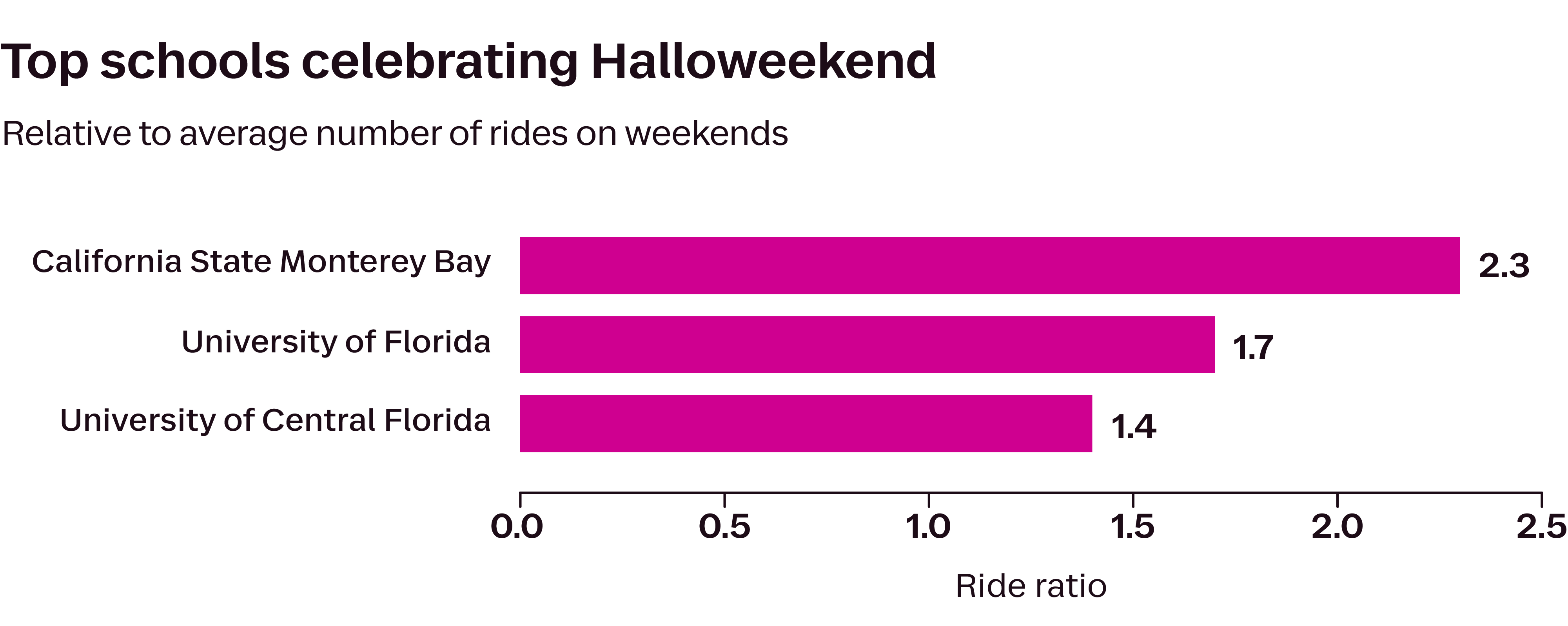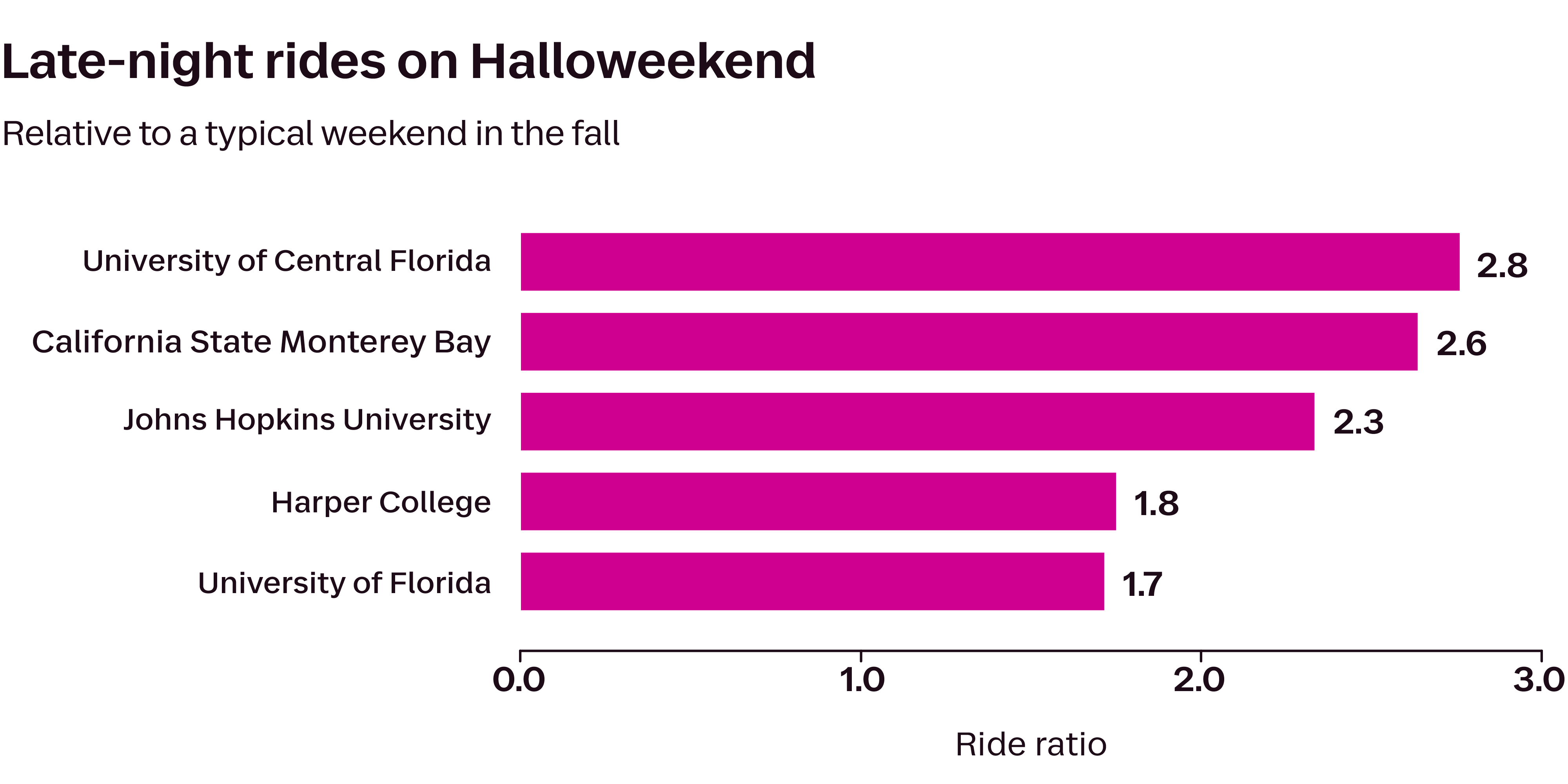 Lastly, we were curious how Halloweekend impacts what time students take rides. The night-owl award goes to the Knights (a pun would just be too easy) from the University of Central Florida, with 2.8 times more late-night rides on Halloween than other fall weekends. They are closely tailed by Cal State Monterey Bay. That said, almost every school we analyzed showed a large increase in the percentage of rides after midnight. So, college-town drivers, get your pumpkin-spiced lattes ready!