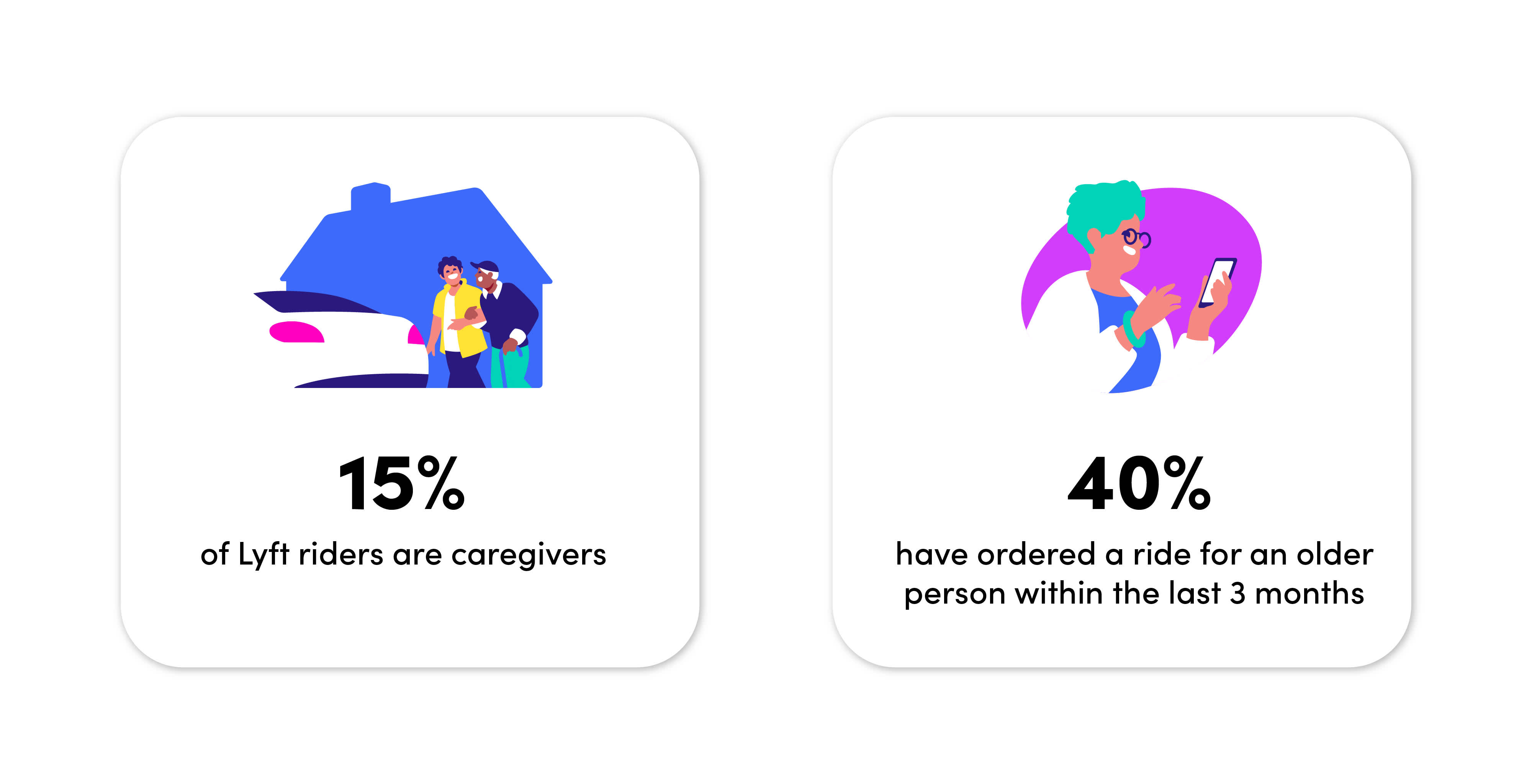 To design Lyft Silver, Lyft first had to identify the barriers older adults face. Overwhelmingly, internal and external evidence pointed to one direction: older adults were uncomfortable with technology. They were less familiar with standard user interfaces, were afraid of doing the “wrong thing”, and became frustrated easily. As a result, older adults tended to lean on caregivers for support: 15% of riders on Lyft’s platform are caregivers, and two out of every five of them say they have ordered a ride for an older person within the last 3 months. Indeed, older adults are 55% more likely to have their ride requested by someone else.