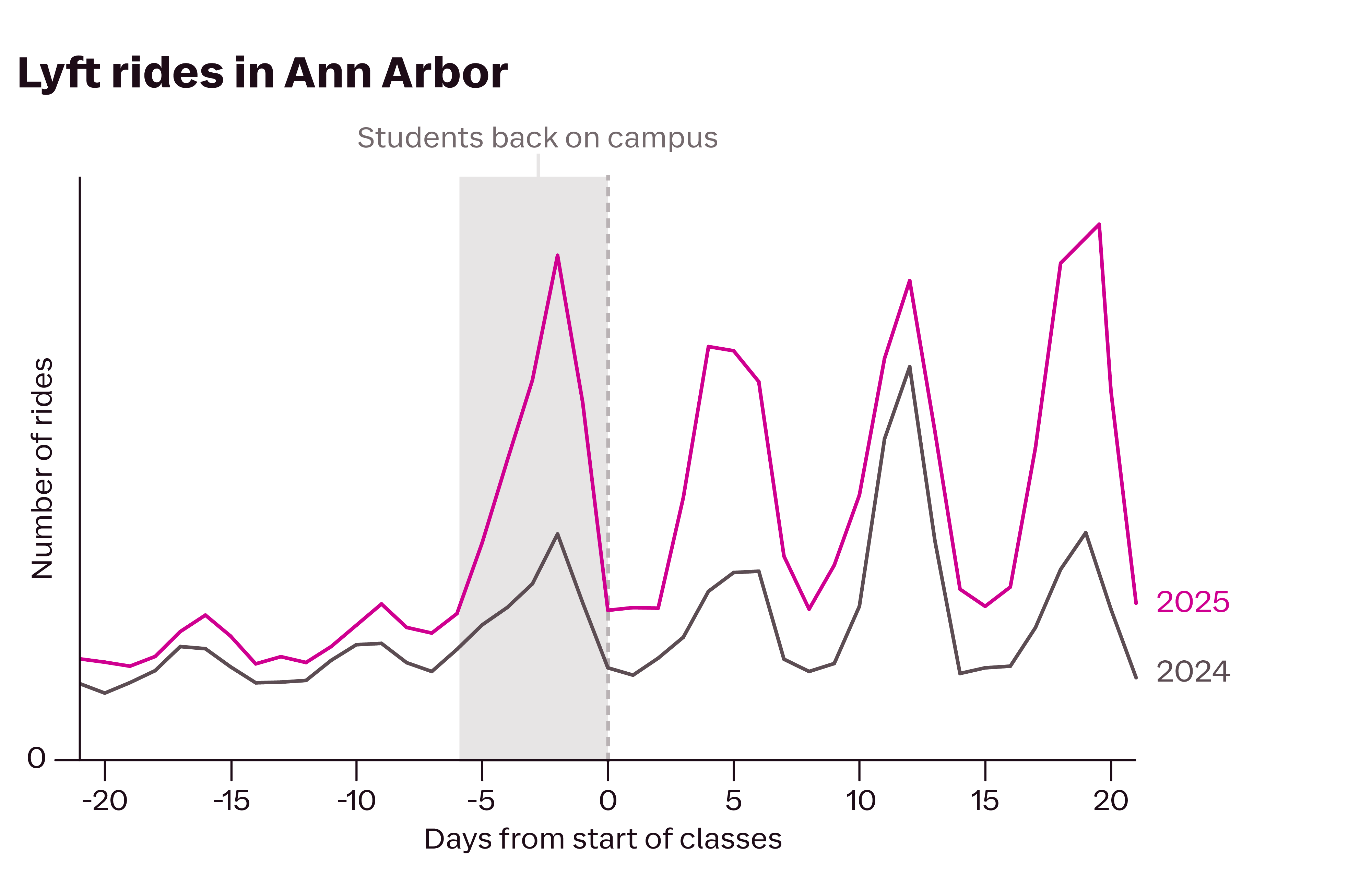 Just three weeks into the new semester, the program has had dramatic results: Thousands of students have entered the program, and Lyft rides in Ann Arbor are roughly twice the level they were in 2024 and nearly three times what they were in the evening hours — when the program is active.