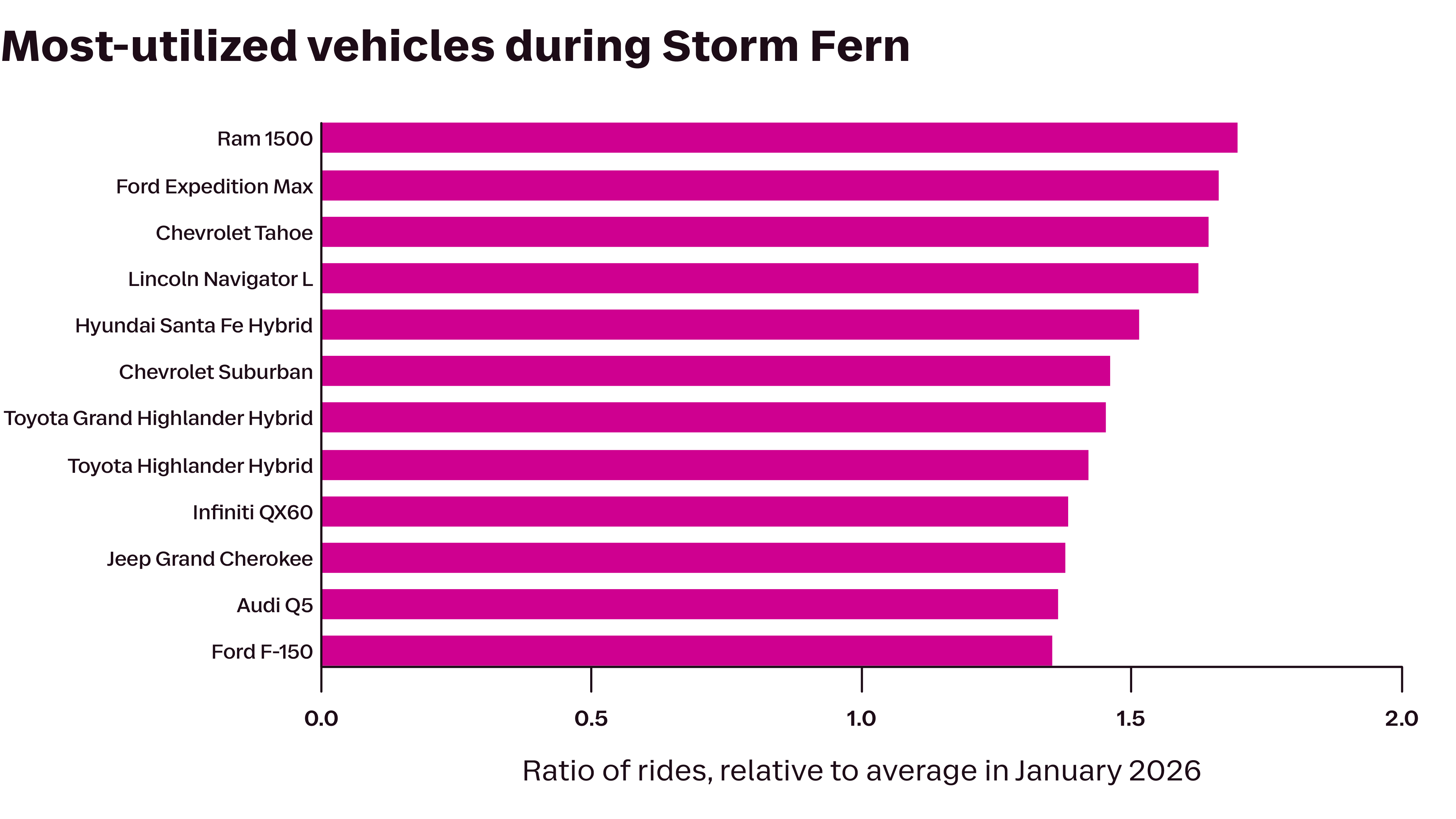These statistics also point to the value of having a diverse fleet of vehicles on rideshare. When the winter gets harsh, not all drivers choose to drive. A dive into Lyft’s data from January 25 to 27 shows that drivers with trucks and SUVs were most likely to respond to the increased demand: Drivers with Ram 1500s completed 70% more rides than usual, and drivers of the Ford Expedition Max, the Chevrolet Tahoe, and the Lincoln Navigator completed over 60% more rides.