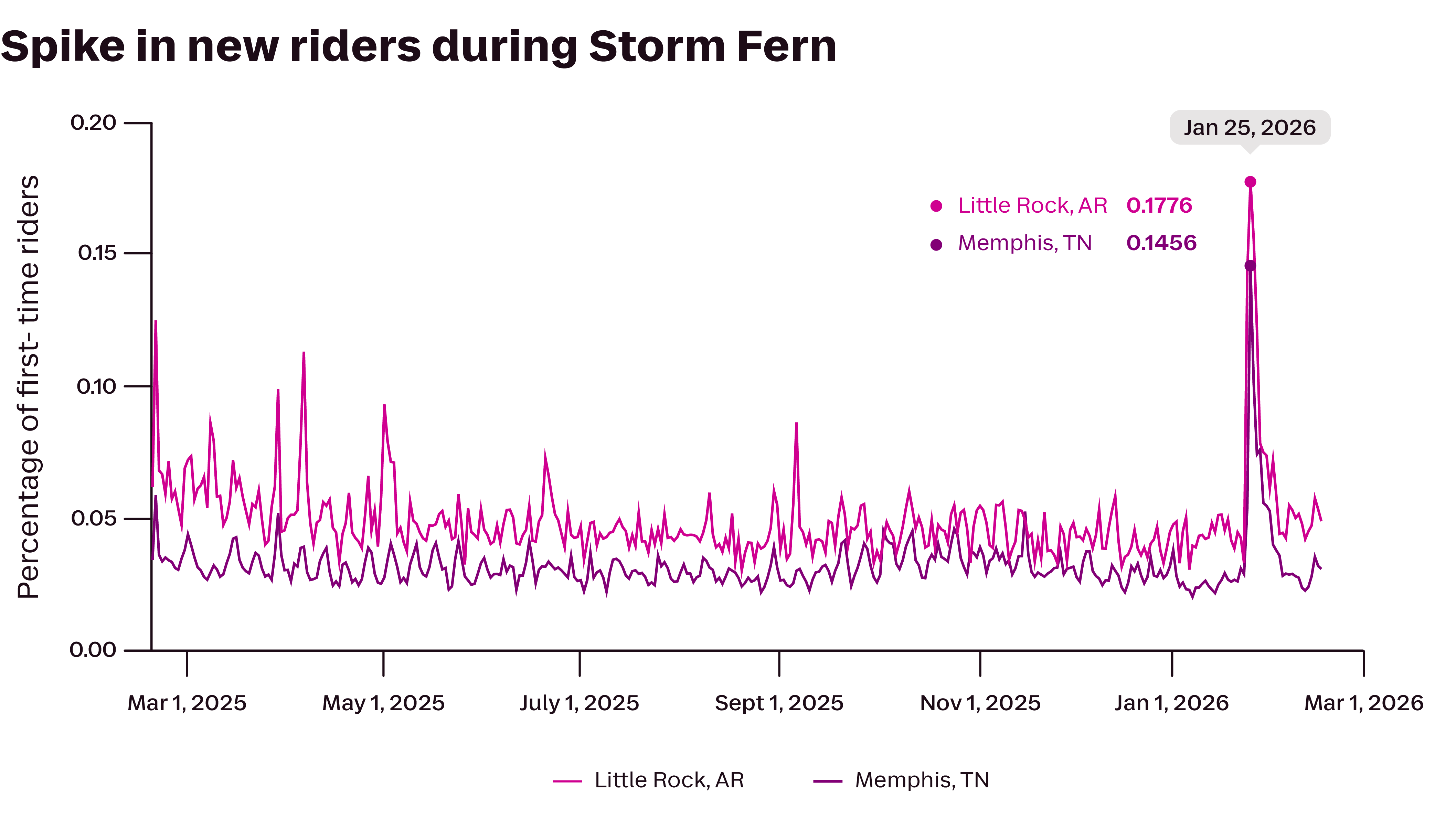 Indeed, on January 26 — the first workday after Storm Fern hit — the share of ride requests by new riders in heavily impacted regions was up 30%. This was particularly true in places that don’t normally receive heavy snow, like Little Rock, Arkansas, and Memphis, Tennessee, where the level of new riders was over three times its typical level compared with January 25.