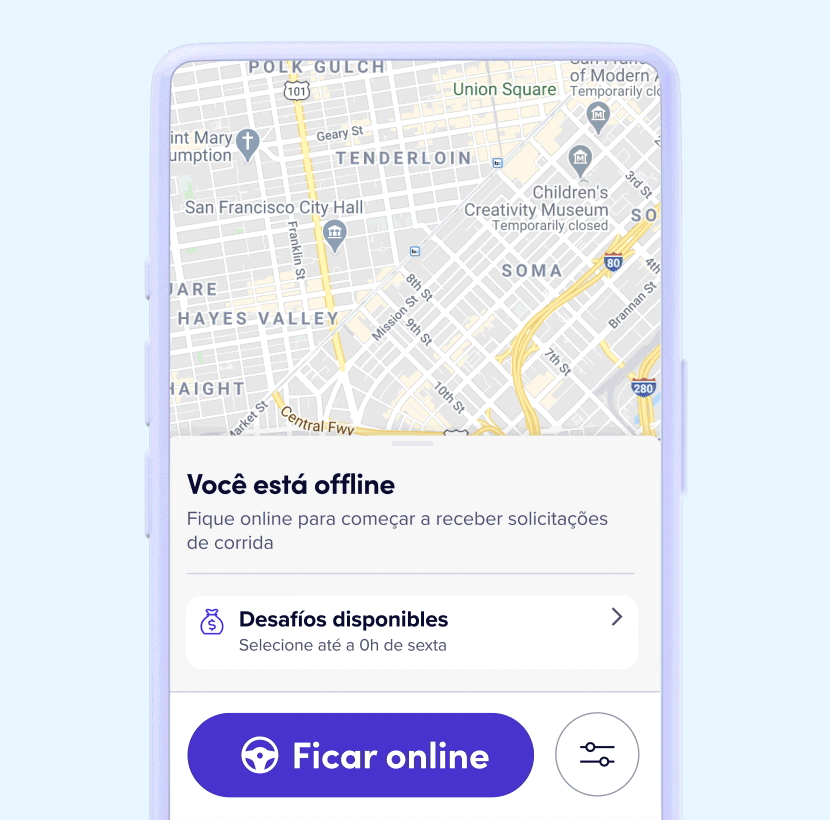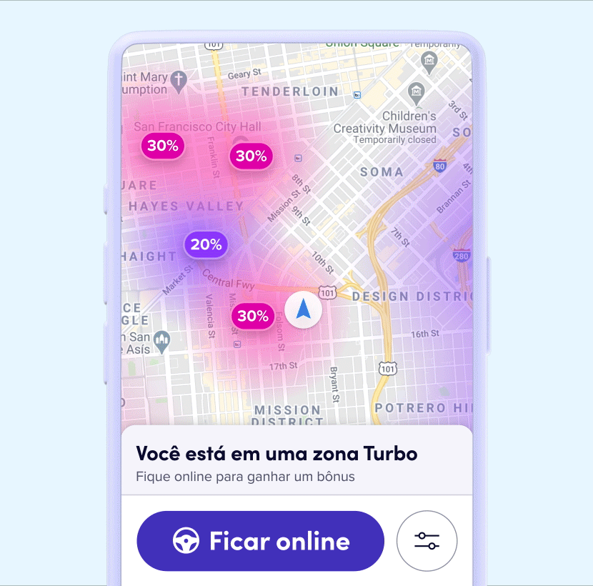 Ganhe de 10% a 40% a mais por corrida com o Turbo. Você verá as ofertas Turbo em seu organizador semanal. Basta dirigir quando elas forem oferecidas e ver seus ganhos aumentarem. O Turbo está disponível apenas em regiões selecionadas.