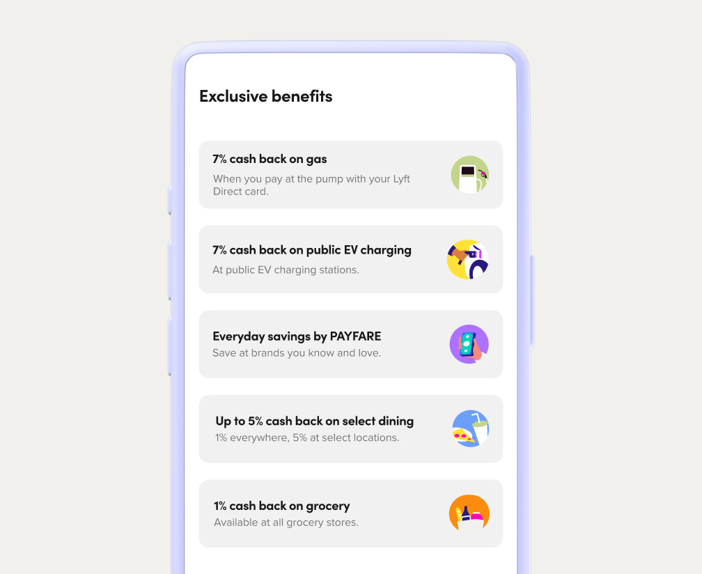 Gas, grocery, restaurant and public EV charging merchant classification is subject to Mastercard rules. For cash back on gas, only payments made at the pump are eligible as payment inside the gas station is not generally eligible for cash back. Cashback rewards are earned for select purchases using your Lyft Direct business debit card and become available for redemption as those purchases settle. You will become ineligible for select cash back rewards if you have not received a Lyft payout into your Lyft Direct business account in the previous 90 days. Payments via third-party apps are not eligible for cash back. Use your Lyft Direct business debit card to pay. Reward categories and amounts subject to change without notice.