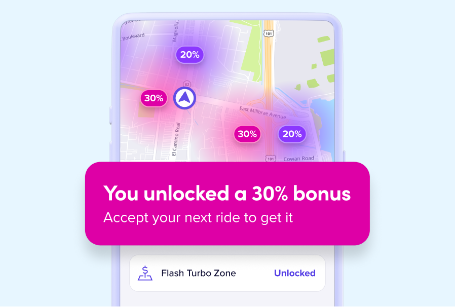 See where to earn more in real time with Flash Turbo. Just drive into a zone on your map to unlock a bonus on your next ride.