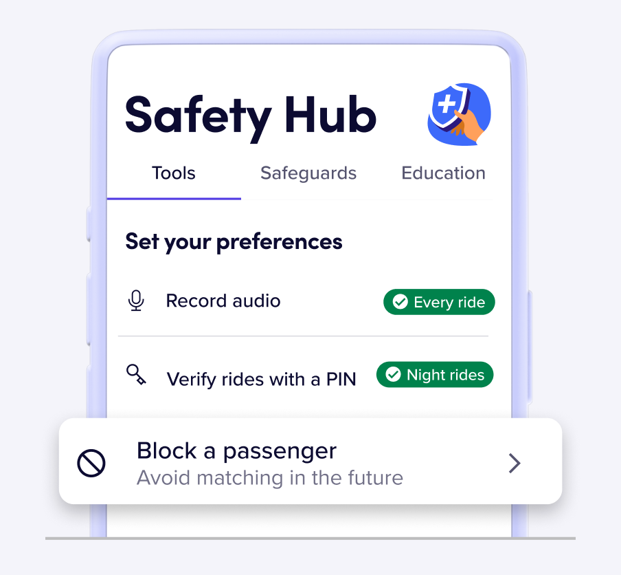 Learn about always-on safety measures and customize your safety tools all in one place—including dashcam discounts, block a passenger, and more.