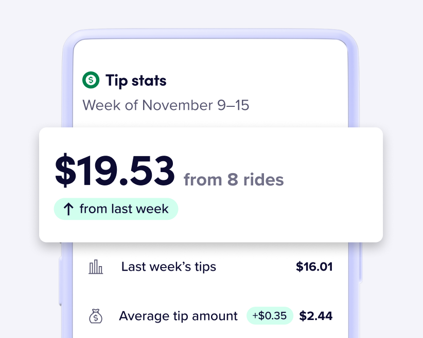 Get a detailed breakdown of tip earnings over time and ideas for how to increase them in the ‘Earnings’ tab. Plus, say ‘thank you’ to all your riders at the same time.