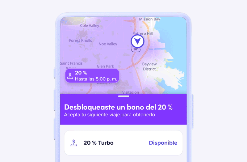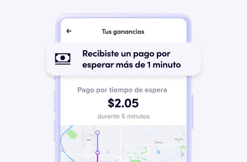 Comenzarás a ganar pagos por tiempo de espera después de solo un minuto.1 Y el pago será más alto si el viaje tiene un bono Turbo.
