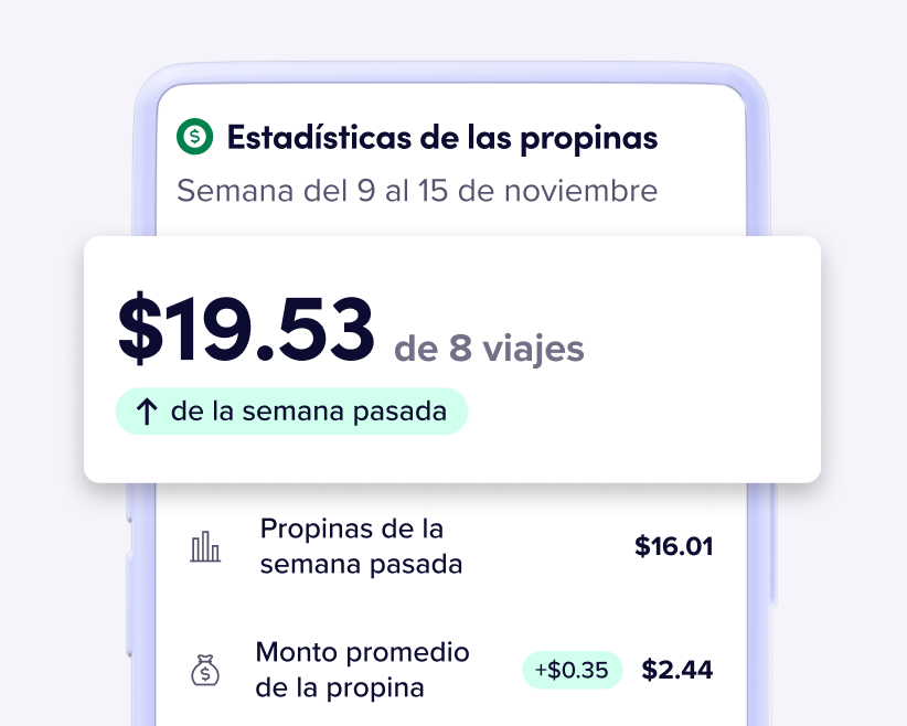 Obtén un desglose detallado de las ganancias por propinas en el transcurso del tiempo e ideas sobre cómo aumentarlas en la pestaña “Ganancias”. Además, dales las gracias a todos tus viajeros al mismo tiempo.
