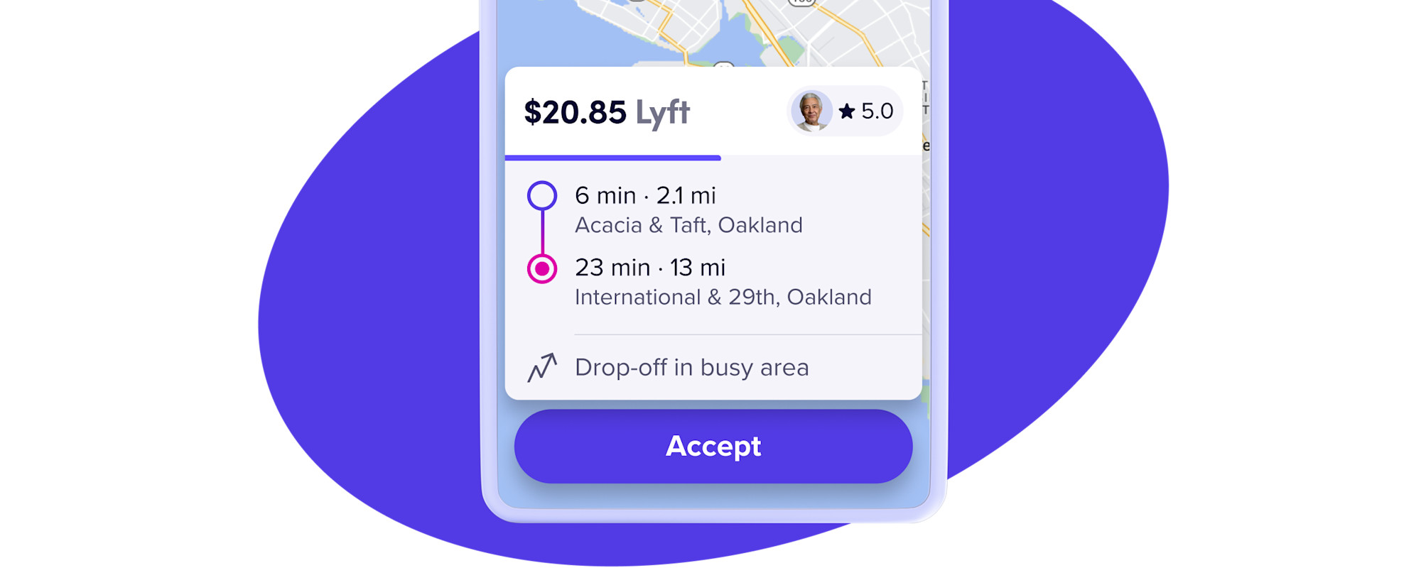 See the destination: Preview the estimated time, distance, and a map view of the full ride when you receive the request.