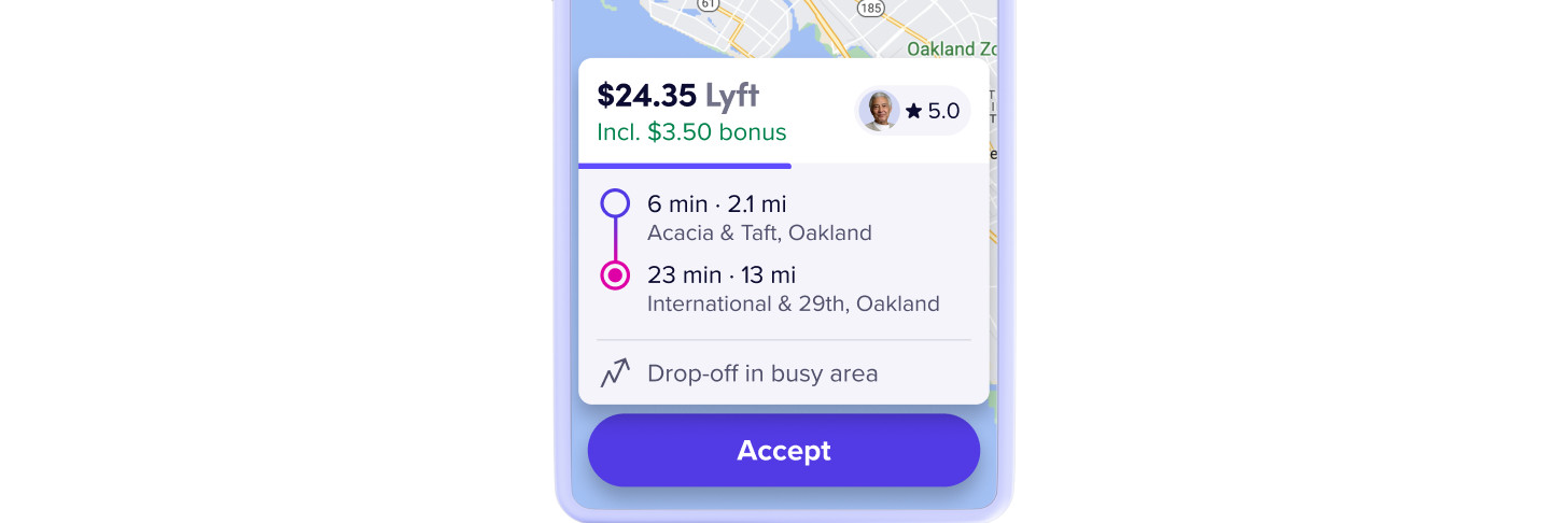 Upfront pay makes earning simpler by removing the guesswork. Now you can see what you'll make before you accept a ride. Knowing all the ride details will help you decide if the ride is worth it.
