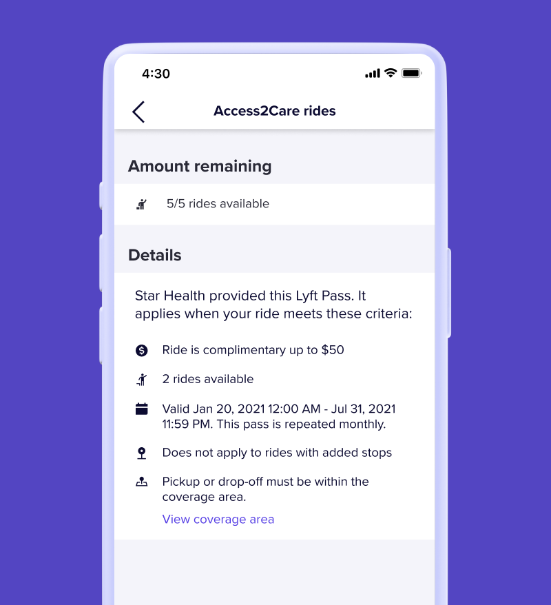 Lyft Pass lets organizations cover all or a portion of the cost of your ride, so it’s easier for you to get from A to B. And don’t worry about a thing — eligible rides apply the pass automatically.