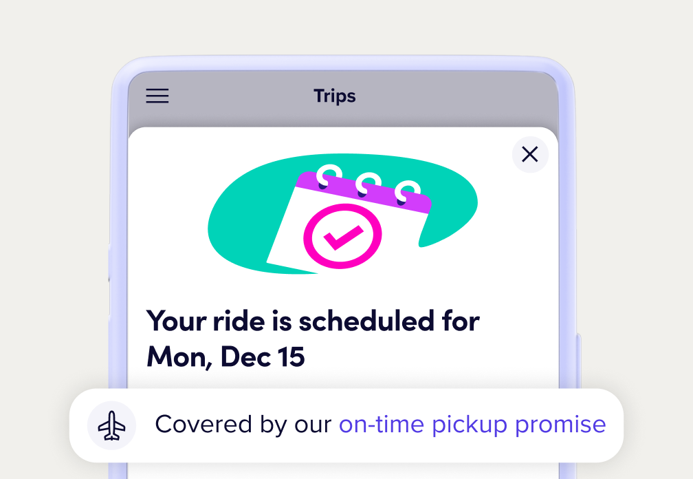 Scheduled rides to the airport are covered by our on-time pickup promise. Get up to $100 in credits if you’re picked up 10+ minutes late. Terms apply.